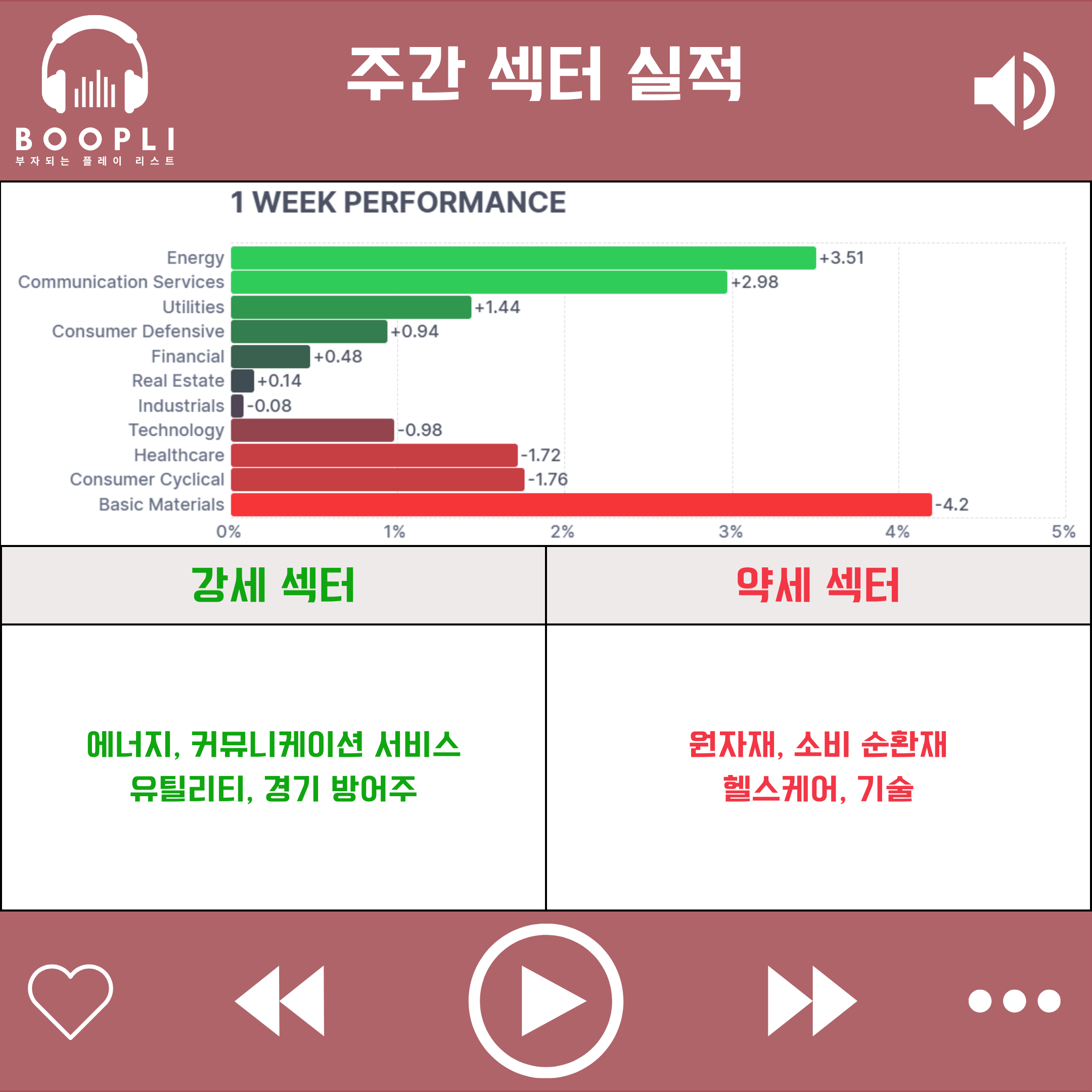 이번 주에는 미국의 이란 사태 군사 개입 가능성으로 에너지 섹터가 상승을 주도했고, 이어서 커뮤니케이션 서비스, 유틸리티, 경기 방어주 순으로 강세를 보였다.
