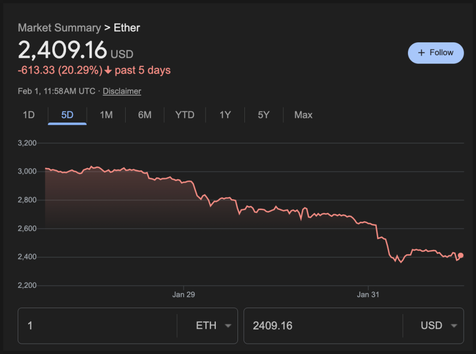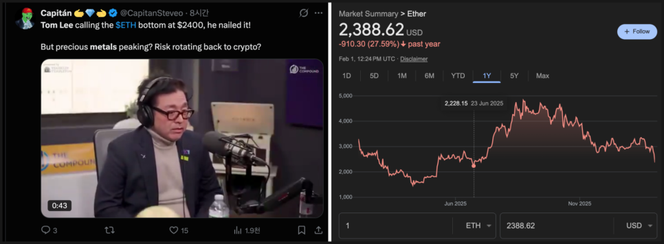 이더리움은 현재 2400 달러 밑으로 떨어지고 있습니다. 물론 큰 거래량을 동반해 강한 반등이 나와준다면 상황이 달라질 수도 있겠습니다만, 하락이 계속된다면 이것으로 톰 리는 A) 2025년 11월 말에 이더리움이 바닥을 찍었다는 선언과 B) 2026년 1월까지 이더리움이 폭등할 것이라는 예측과 3) 귀금속이 고점을 찍으면서 이더리움이 2400 달러를 살짝 찍고 오를 것이라는 예측 모두 틀리게 되었습니다. (물론 귀금속 고점 예측은 맞을 가능성이 있습니다만) 과연 이더리움의 2월은 어떻게 흘러갈지 지켜보도록 하겠습니다.