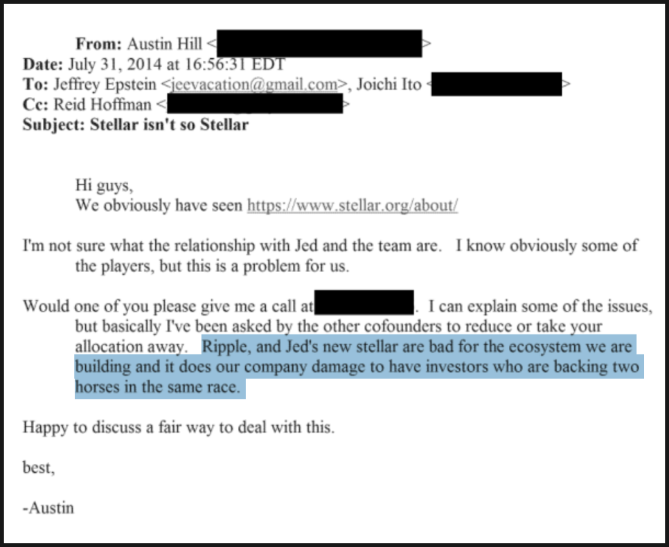 또 다른 문서에서는 리플과 스텔라를 둘러싼 내부 갈등에 엡스타인이 수신자로 등장합니다. 2014년 이메일 흐름을 보면, 스텔라 프로젝트가 리플 생태계에 부정적이라는 문제 제기가 있었고, “한 회사가 같은 레이스에서 두 마리 말을 동시에 후원하는 건 생태계에 해롭다”는 노골적인 표현까지 등장합니다. 초기 크립토 생태계에서 투자 배분과 영향력 싸움이 얼마나 민감했는지를 보여주는 대목인데, 엡스타인이 이 대화의 수신자에 포함돼 있다는 점은 코인 생태계에 의미 있는 위치에 있었다는 인상을 줍니다.