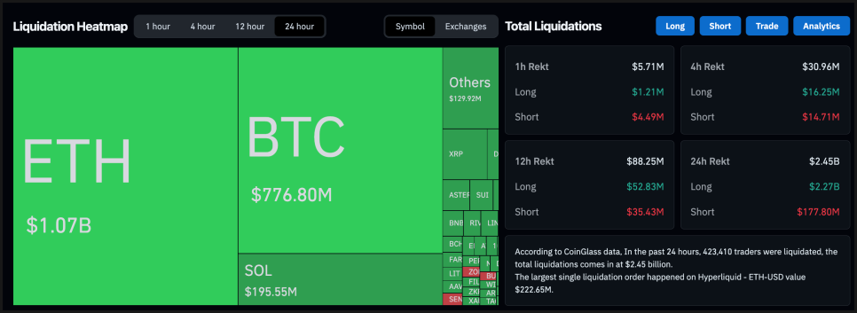 하루 만에 사라진 암호화폐 전체 시가총액은 약 1,110억 달러, 레버리지를 쓴 포지션 청산 규모는 16억 달러에 달했습니다. 특히 비트코인과 이더리움에 청산이 집중됐다는 점이 눈에 띄죠. 단기 반등을 노린 포지션들이 한꺼번에 정리되면서 하락이 더 가팔라진 구조입니다.