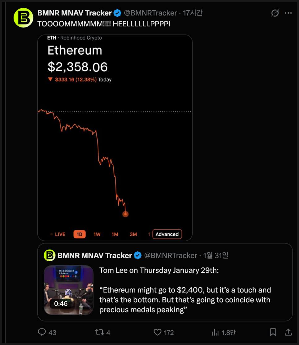 문제는 타이밍이었습니다. 비트마인은 불과 지난주에만 이더리움 4만 개 이상을 추가 매수했는데, 그 직후 시장이 급격히 꺾였던 거죠.