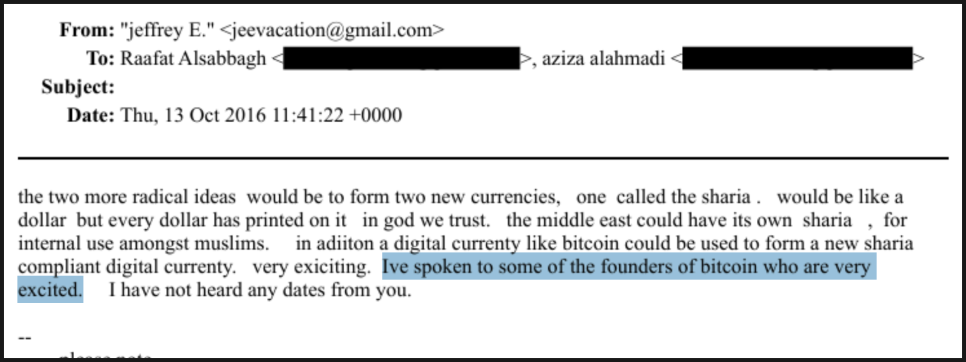 게다가 이번 엡스타인 파일 공개는 해외 코인 투자자들까지 긴장시키고 있는데요. 법무부가 공개한 약 300만 페이지 분량의 자료를 보면, 엡스타인이 비교적 이른 시기부터 코인에 직접적인 관심과 네트워크를 갖고 있었다는 정황이 드러납니다. 2016년 이메일에서는 중동권을 겨냥한 ‘샤리아(이슬람 율법) 기반 통화’ 아이디어를 언급하면서, 비트코인 같은 디지털 화폐를 활용해 샤리아 규범에 맞는 새로운 디지털 통화를 만들 수 있다고 말합니다. 특히 “비트코인 창립자들 중 일부와 이야기를 나눴고, 그들이 매우 흥미로워했다”는 표현이 나오는데요. 사실 여부를 떠나, 최소한 엡스타인이 스스로를 비트코인 핵심 인물들과 접촉 가능한 위치에 있다고 인식하고 있었다는 점은 분명해 보입니다.