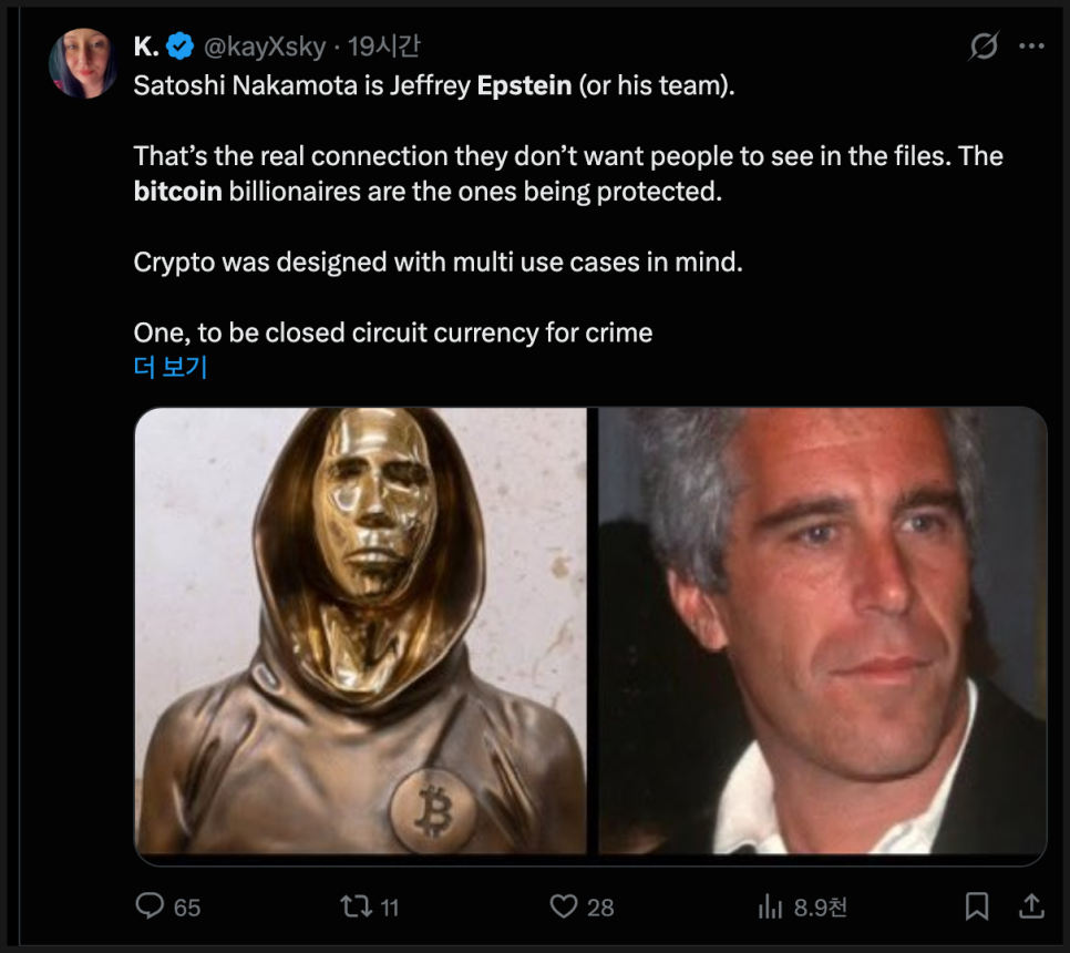 중요한 건 이게 기술이나 네트워크 자체의 문제는 아니라는 점입니다. 블록체인이나 비트코인의 설계가 훼손된 것도 아니고, 특정 프로젝트의 운영이 당장 흔들리는 것도 아닙니다. 다만 비트코인에 엡스타인이 묻었다, 비트코인 들고 있으면 엡스타인을 지지하는 거나 마찬가지다, 따위의 인식이 SNS에 퍼지면서 이게 더 큰 문제로 번지기 전에 코인을 던졌을 가능성도 있어 보입니다.