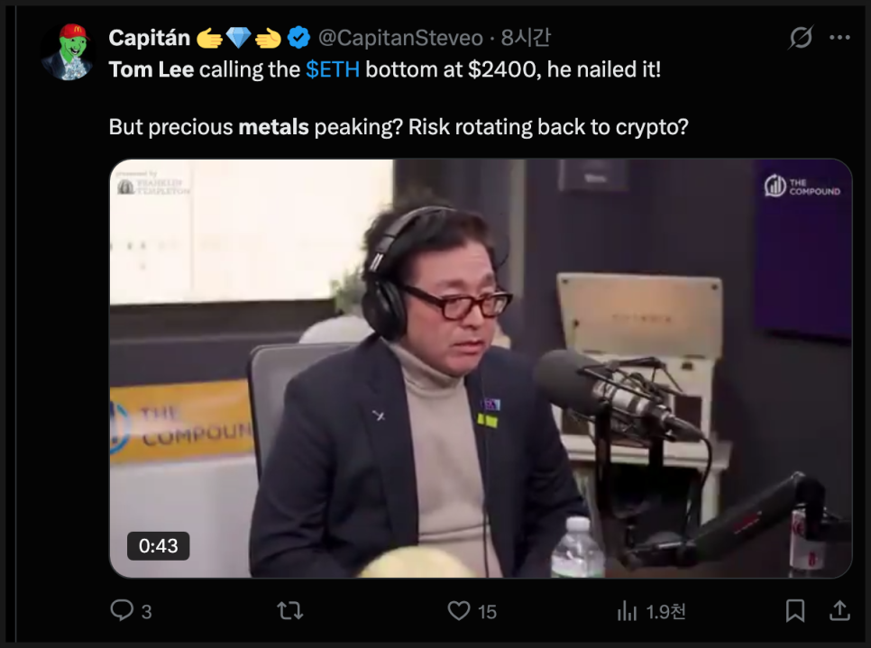 그는 이더리움의 저점 형성과 귀금속 가격의 피크가 시점상 겹칠 가능성도 언급했습니다. 귀금속이 정점을 찍고 나면, 그동안 위축됐던 위험자산 선호가 다시 돌아올 수 있고, 그때 암호화폐가 숨통을 트일 여지가 생긴다는 논리입니다.