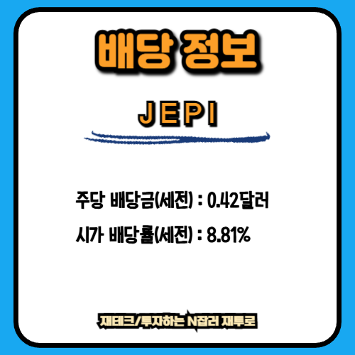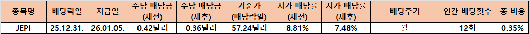 이번에 발표된 JEPI의 배당 정보를 살펴보면 주당 배당금은 세전 0.42달러로 확정되었고 이를 연간으로 환산했을 때 기대되는 시가 배당률은 세전 8.81%라는 매우 높은 수치를 보여주고 있습니다. 이번 배당의 배당락일은 2025년 12월 31일이었으며 지급일은 2026년 1월 5일로 새해의 시작과 함께 기분 좋은 현금 흐름을 만들어 주었는데 세금을 제외한 세후 배당금은 0.36달러이며 시가 배당률 역시 세후 7.48%로 여전히 매력적인 수준을 유지하고 있다는 점이 인상적입니다. JEPI는 연간 12회 배당을 지급하는 월배당 상품으로서 은퇴자나 현금 흐름을 중시하는 투자자들에게 꾸준한 사랑을 받고 있는데 총 보수 비용이 0.35%로 액티브 ETF 치고는 합리적인 편이라 장기 보유에도 큰 부담이 없다는 장점을 가지고 있습니다. 특히 이번 배당률이 8% 후반대를 기록했다는 것은 시장의 불확실성이 지속되는 가운데에서도 JEPI가 가진 커버드콜 전략이 효과적으로 작동하며 투자자들에게 안정적인 수익을 제공하고 있음을 시사하는데 이는 단순히 높은 배당만 좇는 것이 아니라 변동성 장세에서 계좌의 하방을 지지해 주는 역할을 톡톡히 해내고 있다는 뜻이기도 합니다.