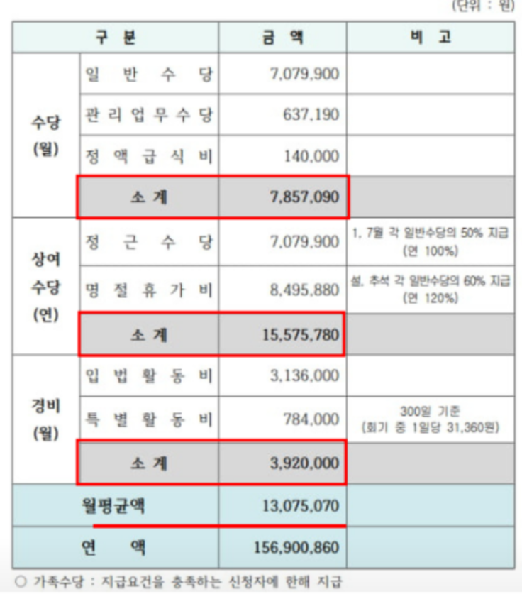 수당+상여+경비 포함 연간 1억 5,690만원을 받습니다.