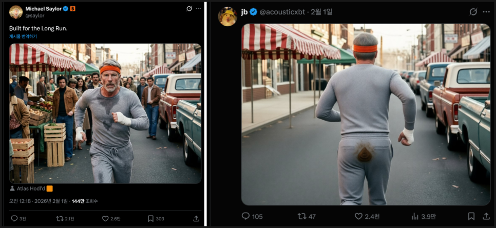 다만 현재 비트코인과 같이 마이클 세일러에 대한 조롱도 점점 강해지고 있습니다. 비트코인 가격이 떨어져도 투자는 마라톤 같은 장기전 이라는 포스팅의 글인데, '바지에 지린듯한' AI 이미지 댓글이 달리기도 하고