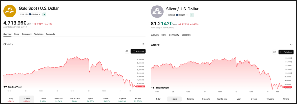 배경에는 미국 연준 의장 후보로 케빈 워시(Kevin Warsh)가 지명되면서 달러가 급등한 영향이 있습니다. 달러가 강해지면, 달러로 가격이 매겨지는 금속 자산은 해외 투자자 입장에서 부담이 커집니다. 그 결과 ‘하드 머니’ 전반에서 리스크를 줄이려는 매도가 동시에 발생한 것으로 보입니다.
