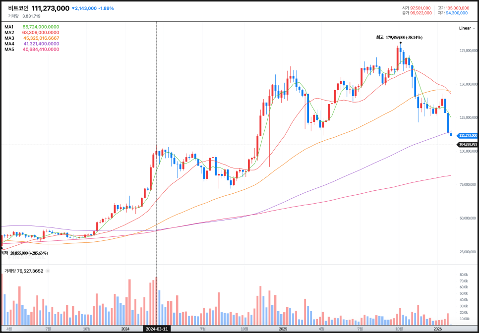 주말 동안의 코인 급락 사태를 좀 더 조명해보겠습니다. 우선 비트코인은 주말 사이 약 7만7천 달러 선까지 급락했고, 작년 10월 고점이었던 12만6천 달러 대비 시가총액 기준으로 약 8천억 달러가 증발했습니다.