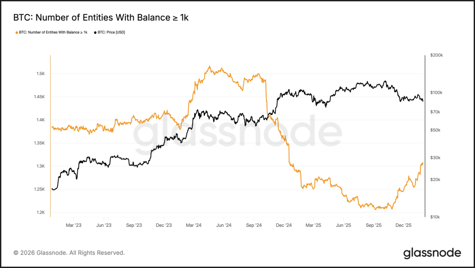 반대로 1,000개 이상을 보유한 ‘메가 고래’들은 조용히 물량을 늘리고 있습니다. 2024년 말 이후 보지 못했던 수준까지 다시 쌓고 있는데, 공포에 빠진 개인 투자자들이 던진 물량을 흡수하고 있는 셈입니다. 다만 이 매수 규모가 가격을 다시 끌어올릴 만큼 크지는 않았습니다.