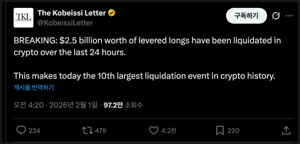 세 번째는 이른바 ‘청산 효과’입니다. 가격 하락이 시작되자, 이미 취약해져 있던 시장 구조가 기계적으로 무너졌습니다. 코인글래스(Coinglass) 데이터에 따르면 현지 시간으로 토요일 하루 동안 약 20만 명에 가까운 트레이더 계좌가 사실상 전멸했고, 강제 청산 규모는 수 시간 만에 8억5천만 달러를 넘어서 결국 25억 달러에 달했습니다. 레버리지를 써서 투자한 경우, 가격이 일정 수준 아래로 내려가면 거래소가 자동으로 포지션을 정리합니다. 이 강제 매도가 다시 가격을 끌어내리고, 또 다른 청산을 부르는 도미노 효과가 이어진 거죠.
