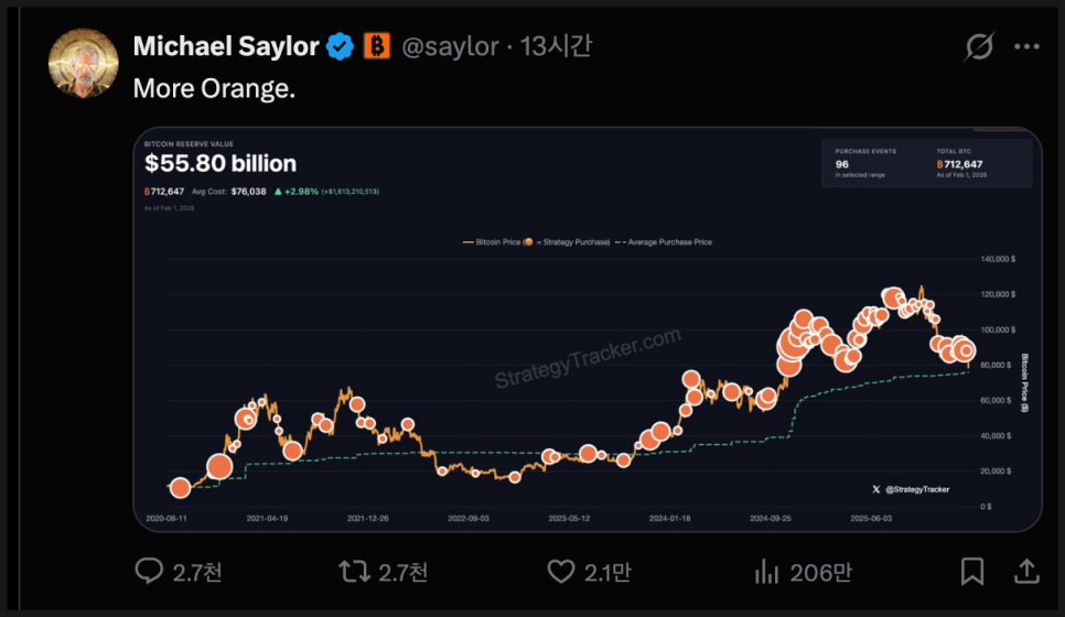 다만 마이클 세일러는 주말 동안 'More Orange'라는 포스팅을 올리며 비트코인 매수를 계속 진행할 것을 암시했습니다.