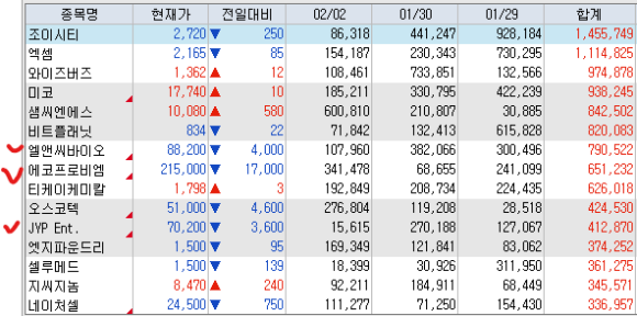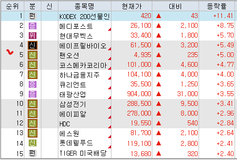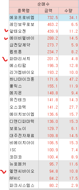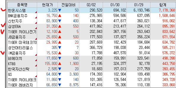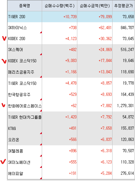 매도 : 삼일제약 SK하이닉스 현대건설 SOL화장품TOP3플러스 오리온홀딩스 포스코퓨처엠 POSCO홀딩스 삼성전자(+116.36%) 삼성전자우 이수화학 삼성SDI SOL한국원자력SMR LSElectric 성광벤드 한국전력 삼성증권 SK텔레콤 시노펙스 제일기획 KT 케이엠더블유 우리기술 NAVER 감성코퍼레이션(+30.59%) 솔브레인홀딩스(+33.75%) 주성엔지니어링(+47.72%) 레드캡투어 현대로템 엘앤에프 KODEX200 이노와이어리스(+31.94%) 대주전자재료 아바코 에코프로(+32.58%) 하나금융지주(+44.82%) 테크윙 상아프론테크 Tiger반도체 후성 동운아나텍 LX세미콘 KODEX레버리지 한미약품 KODEX골드선물 BNK금융지주 iM금융지주 휴젤 클래시스 케어젠(+56.69%) 심텍 LK삼양 KODEX코스닥150 원익ips(+44.08%) ACE베트남VN30 에코프로비엠 실리콘투 이녹스첨단소재 레이크머티리얼즈(+36.10%) 카카오뱅크 위더스제약 티앤엘 티엘비 카카오페이 에이프릴바이오 HPSP(+30.55%) ACEKRX금현물 Tiger2차전지TOP10레버리지 KODEX로봇액티브 엔젤로보틱스 SOL조선TOP3플러스 ACEKPOP포커스 엘케이켐 KODEX금융고배당TOP10 코오롱티슈진(+49.34%)