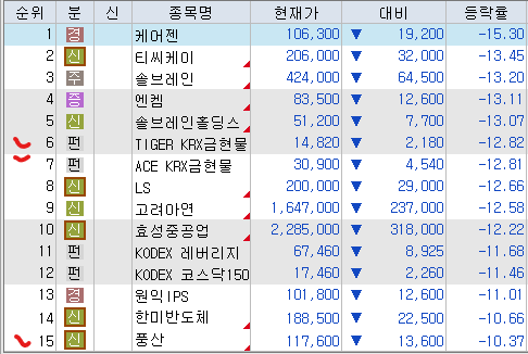 <시총 1조 원 이상 등락률 상위 종목>