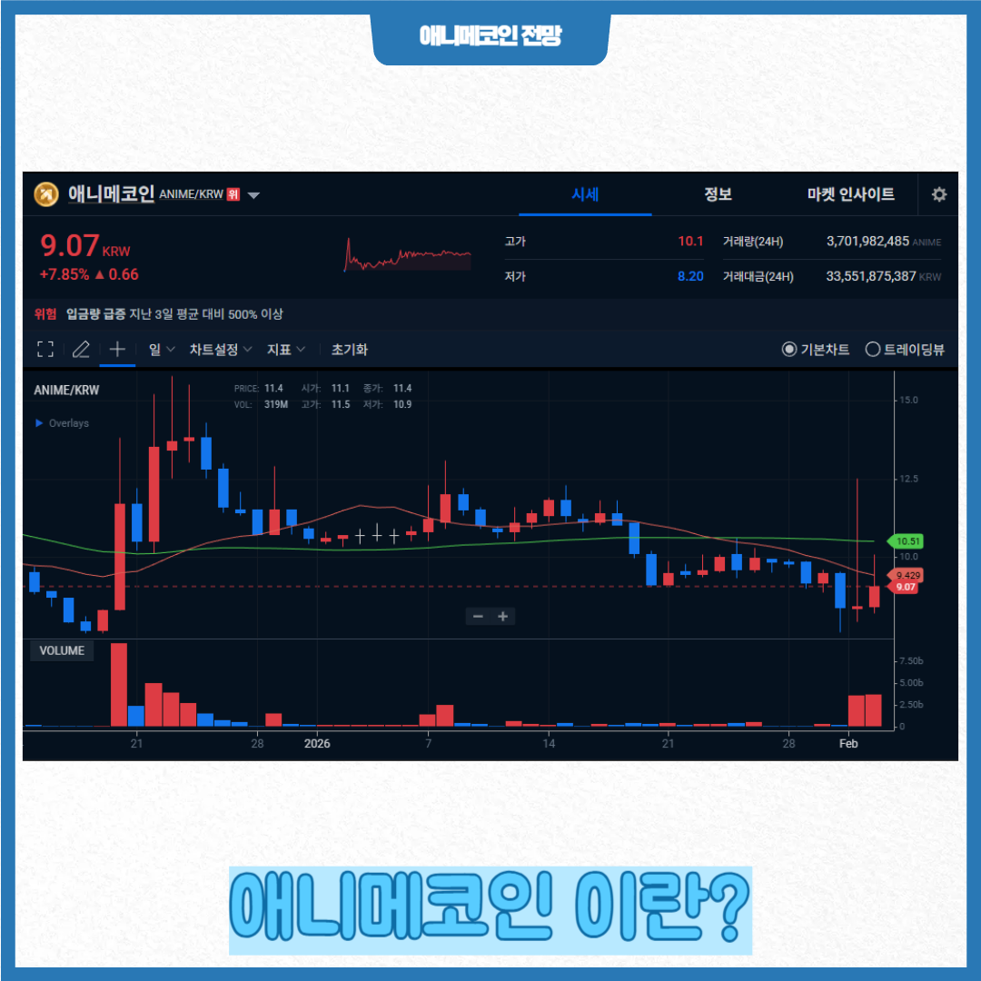 최근 가상자산 시장에서 콘텐츠 기반 프로젝트에 대한 관심이 다시 높아지고 있습니다. 그중에서도 애니메이션과 웹툰, 캐릭터 IP를 중심으로 한 애니메코인은 단순한 밈 코인을 넘어 하나의 콘텐츠 생태계를 지향하는 프로젝트로 분류되고 있습니다. 엔터테인먼트 산업과 블록체인의 결합이라는 측면에서 중장기적인 성장 가능성을 검토해볼 필요가 있습니다.