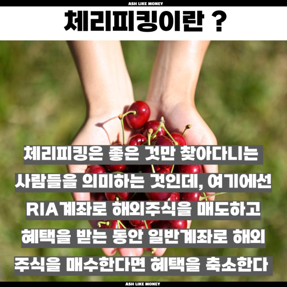 여기서 만약 RIA로 해외주식을 매도하고 혜택을 받는 동안 해외주식이 조정된다면 ? 당연히 사고 싶어질 것이다. 그래서 정부에선 이를 막기 위해 체리피킹을 실시한다. RIA로 해외주식을 매도하고 혜택을 받는 동안 일반계좌로 해외주식을 매수한다면 해당 금액에 비례하여 소득공제 혜택을 적용시킨다. 즉, RIA를 이용하는 동안에는 다른 계좌에서 해외주식을 늘리지 말라!는 뜻이다.