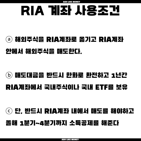 RIA계좌를 사용하려면 해외주식을 RIA계좌로 옮기고 RIA계좌 안에서 해외주식을 매도한다. 매도대금을 한화로 환전하고 1년간 RIA계좌 안에서 국내주식이나 국내 ETF를 보유하고 있다면 소득공제가 가능하다. 단, 반드시 RIA계좌 내에서 매도를 해야하고 올해 1분기~4분기까지 혜택을 준다. 내년에도 시행될 지는 미지수이다.