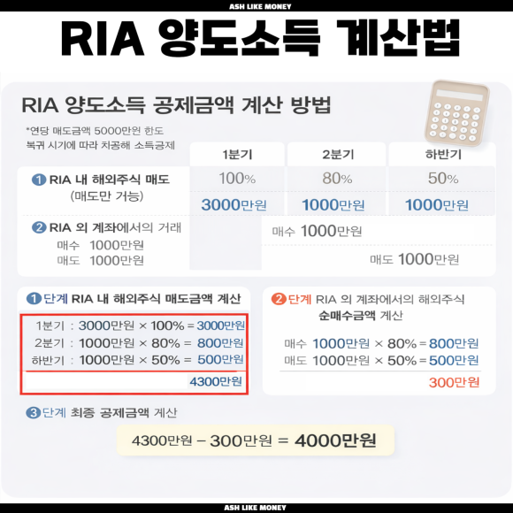 RIA 계좌는 1인당 해외주식 매도금액이 한도가 있는데 최대 5천만원이다. 이 말은 해외주식을 5천만원까지 판 금액에 대해서만 적용된다는 것이다. 만약, 1억을 팔면 5천만원까지만 적용된다. 그래서 소액 투자자들이나 다시 돌아올 만하지 거금으로 투자하는 기관들에게는 불리하다. 그래서 기관이나 법인들은 적용대상이 아니다.