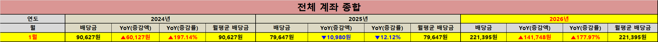 새로운 한 해의 문을 여는 2026년 1월의 배당 가계부를 정리하며 투자자로서 지난 시간들을 복기해보는 시간을 가졌습니다. 이번 한 달 동안 제 포트폴리오의 여러 계좌를 통해 입금된 총 배당금은 221,395원으로 집계되었는데 이는 작년인 2025년 1월에 수령했던 79,647원과 비교했을 때 무려 177.97%라는 압도적인 성장률을 기록한 수치입니다.