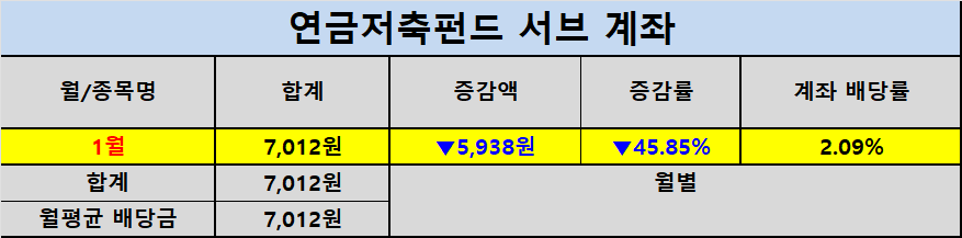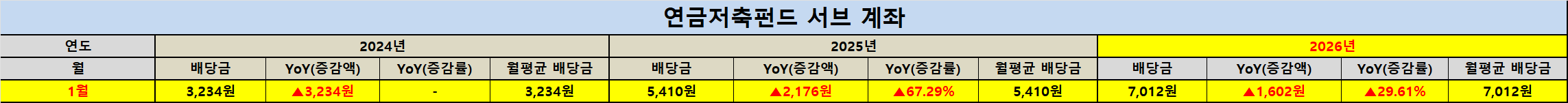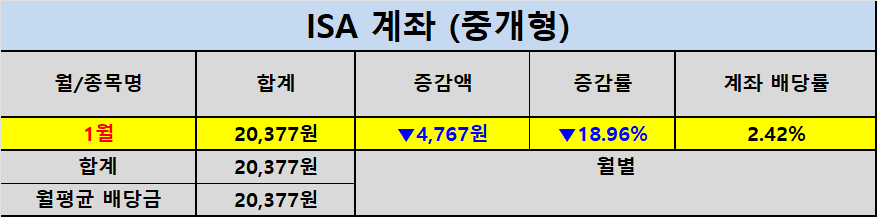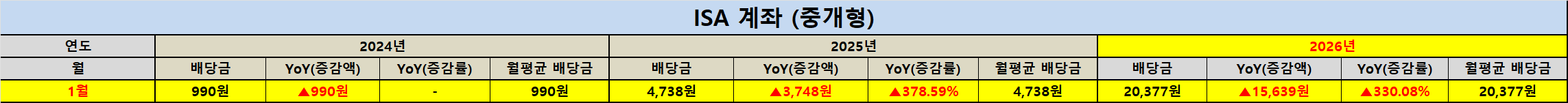 연금저축펀드 서브 계좌 또한 7,012원의 배당금이 입금되며 작년 1월의 5,410원과 비교해 29.61%라는 높은 성장세를 기록하였네요. 특히 이번 결산에서 가장 고무적인 부분은 ISA 절세 계좌의 비약적인 도약인데 이번 달 수령액인 20,377원은 작년 1월 수령했던 4,738원보다 무려 330.08%나 급증한 금액입니다.
