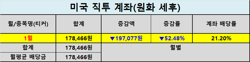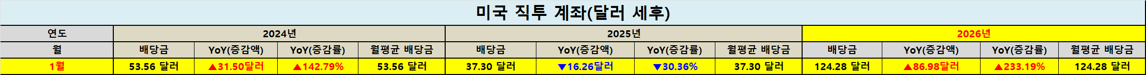 미국 주식 직투 계좌에서는 이번 달 원화 기준 178,466원 달러 기준으로는 124.28달러의 배당금이 입금되었습니다. 지난해에는 ULTY와 YMAX 같은 초고배당이면서 굉장히 리스크가 큰 종목을 편입하여 운영하였기에 월 현금흐름이 엄청났지만 1월에 전 수량을 매도했기 때문에 당장 2월부터는 직투 계좌의 월 배당금이 크게 하락할 것으로 예상됩니다.