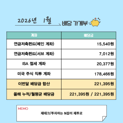 올해의 누적 배당금이기도 한 이번 달의 결산액은 배당 가계부 썸네일에 기록된 것처럼 월평균 221,395원의 기분 좋은 시작을 알리고 있네요. 숫자가 늘어나는 기쁨도 크지만 그보다 더 값진 것은 제가 설정한 장기 투자라는 나침반이 흔들림 없이 올바른 방향을 가리키고 있다는 확신을 얻은 점이라 생각합니다.