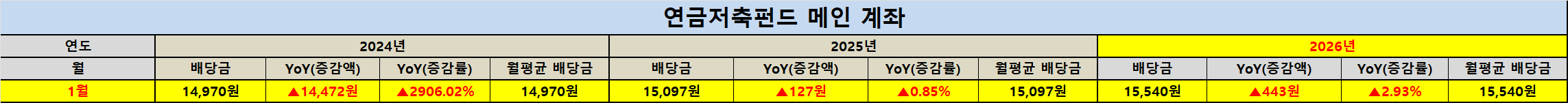 2년 전인 2024년 1월의 전체 배당금이 90,627원이었던 점을 떠올려보면 그동안의 꾸준한 적립식 매수와 배당 재투자가 결합하여 자산의 기초 체력이 얼마나 단단해졌는지 여실히 체감할 수 있었습니다.