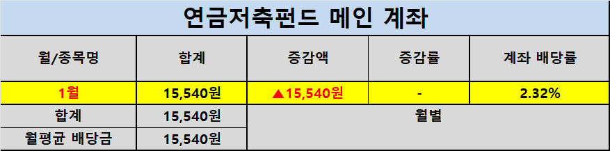 먼저 연금저축펀드와 ISA 계좌로 대변되는 국내 절세 바구니의 현황을 살펴보면 매달 현금 흐름이 눈에 띄게 좋아지고 있음을 알 수 있습니다. 연금저축펀드 메인 계좌의 경우 이번 달에 15,540원의 배당금을 수령하였으며 이는 전년 동월인 15,097원 대비 2.93% 완만하게 성장한 결과입니다.