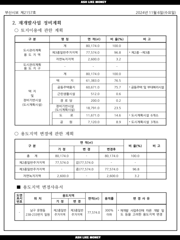 문현6구역의 사업면적은 24,295평으로 약 1,200세대가 들어선다. 계획 용적률이 264%로 3종일반주거지역이지만, 용적률 상향은 크게 없다. 하지만 지방이므로 임대주택이 없고 근린생활시설 면적이 155평이다. 그 외 정비기반시설 면적이 5,694평, 경로당 60평, 공원 2,158평, 도로 3,536평이다.