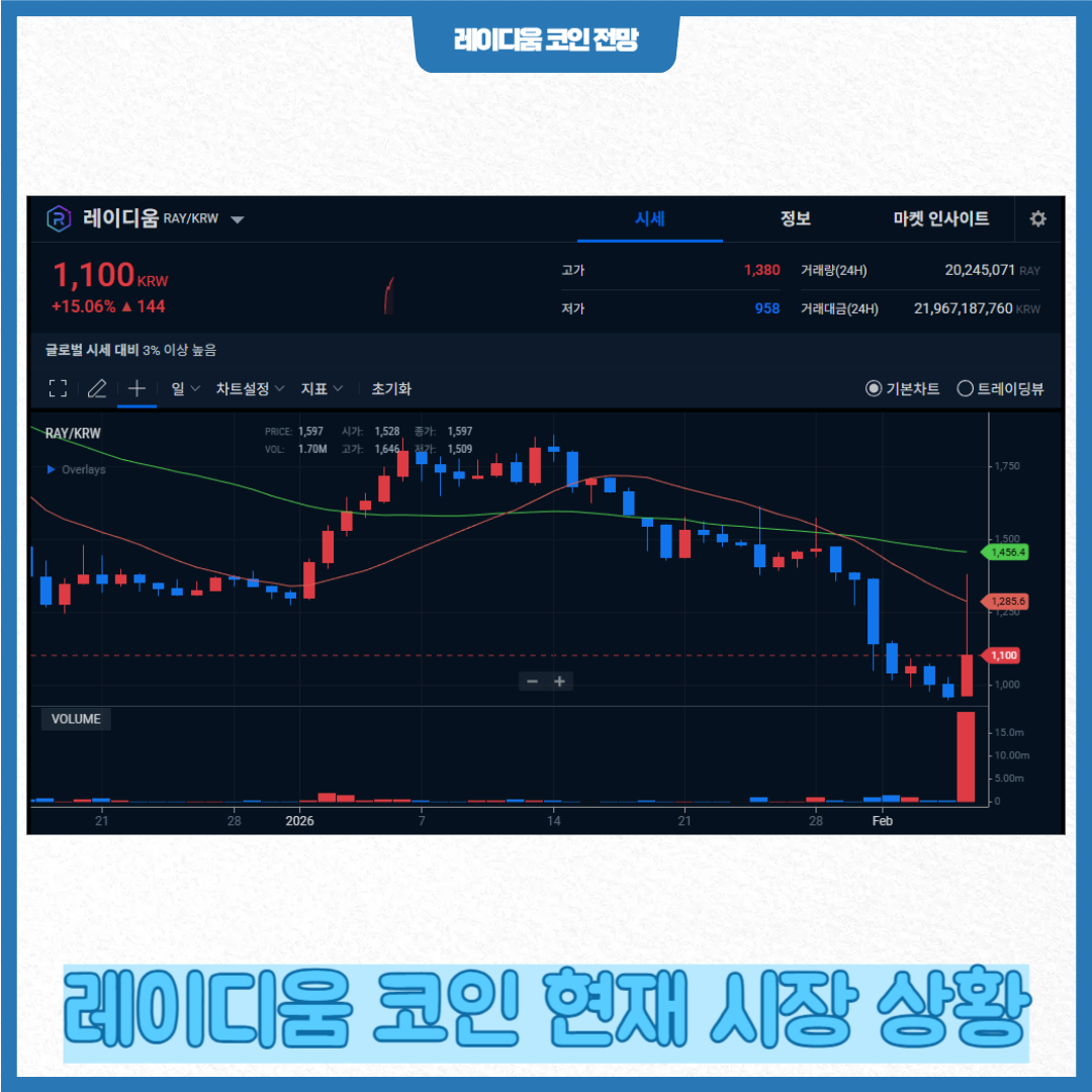 2026년 2월 기준 레이디움의 가격은 약 1,067원 수준이며, 시가총액 2,869억원 정도로 코인마켓 전체에서 중간권에 위치합니다. 가격은 최근 7일 및 30일 기준으로 변동성이 있는 모습을 보였습니다.