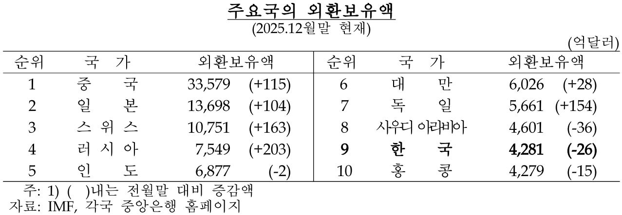 ㅇ 2025년 12월말 기준 우리나라의 외환보유액 규모는 세계 9위 수준이며, 1위 중국, 2위 일본 및 3위 스위스 순으로 집계.