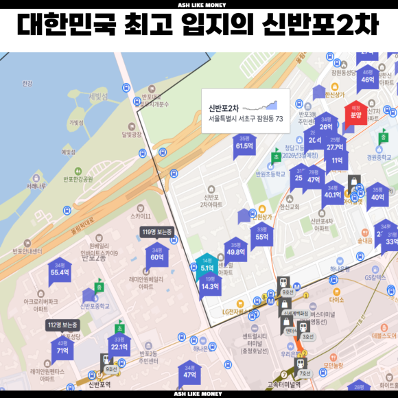신반포2차의 입지는 반포대교 바로 옆이자 한강뷰가 가능한 최상의 입지이다. 옆에는 반원초를 안고 있는 초품아이며 9호선 고속터미널역과 3호선 고속터미널역의 더블역세권, 강남8학군 소속, 대한민국에서 내놓으라 하는 병원과 백화점 등이 즐비한 곳이다. 그래서 현재 최고가로 62억 이상이고 매물도 매우 높게 나와있다. 근처에는 "래미안 원베일리, 메이플자이, 아크로리버파크" 등이 있다.