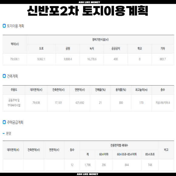 신반포2차의 토지이용계획에 따르면 24,132평에서 도로 2,972평, 녹지 4,932평, 공공공지 121평, 기타시설 267평이다. 아파트가 지어지는 면적은 15,840평으로 기존 용적률이 199%이므로 기존 연면적은 31,521평이고 최대 용적률이 299%라 47,361평이다.