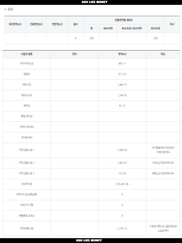여기에 임대주택 면적은 최소 3,909평이고 상가면적은 나와있지 않아 약 500평으로 가정했다. 그래서 일반분양 면적은 11,431평이다. 여기에 관리사무실, 경로당, 어린이집, 공동시설, 커뮤니티 등의 면적이 합쳐 재건축하여 지어지는 총 연면적은 128,997평이다.