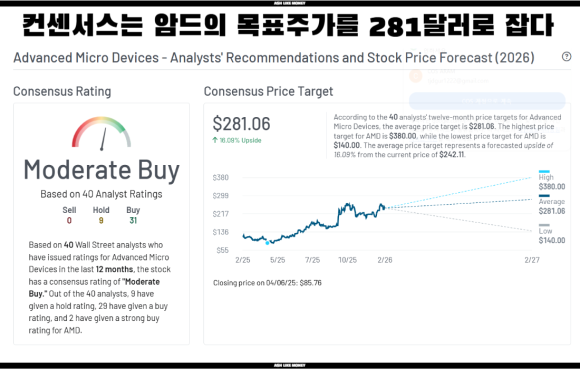 애널리스트들은 아직 강한 상승여력이 있다고 평가하고 있긴 하지만, 부정적인 면모도 있다고 보았다. 엔비디아 같은 강력한 경쟁자들, 수요 불확실성, 반도체 사이클이 다시 돌아오는지, 고평가 논란, 선반영 등이 리스크이다. 평균 목표주가가 281달러이고 현재 실적에서 삐끗하여 폭락했다. 하지만 미래 AI, 데이터센터 성장 수혜주이면서 컨센서스 역시 긍정적으로 평가하는 만큼, 지금 하락은 버티면서 다시 날아오를 때까지 조금씩 주워가는 것이 현명한 방법일 듯 하다.