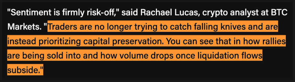 한 애널리스트는 지금 시장은 명확히 위험 회피 국면이며, 트레이더들은 더 이상 급락 구간에서 저가 매수를 시도하지 않고 자금 보전에 집중하고 있다고 보고 있는데요. 반등이 나와도 바로 매물로 소화되고, 청산 물량이 줄어들면 거래량도 급격히 식는 모습이 이를 보여준다고 설명했죠. 핵심 지지선을 여러 번 지키지 못하면서, ‘떨어지면 산다’는 태도에서 ‘확인될 때까지 기다린다’는 태도로 행동이 바뀌었고, 이 자체가 하락 압력을 강화하고 있다는 분석입니다.