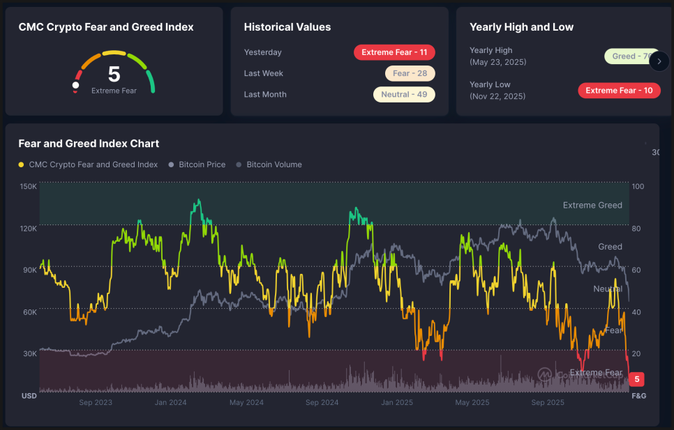 시장 심리를 보여주는 지표도 극단적인 수준입니다. CMC 암호화폐 공포·탐욕 지수는 현재 ‘5’를 가리키고 있는데, 2023년 6월 지수 산출이 시작된 이후 최저치로, 말 그대로 ‘극단적 공포’ 국면입니다. FTX 붕괴 당시 이후 가장 낮은 수준을 기록했다고 합니다.