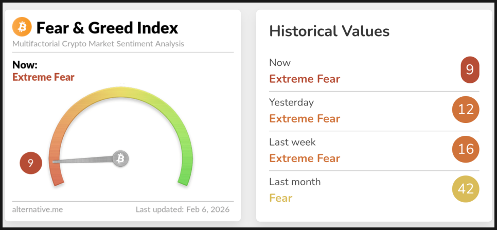 20만 달러는 모르겠고, 어쨌든 현재 시장이 극단적 공포 상황임은 분명합니다. 얼터내티브에서 제공하는 공포·탐욕 지수도 9까지 떨어지면서, FTX 붕괴 당시 이후 가장 낮은 수준을 기록했습니다. 해당 지수는 하루 전에는 12, 일주일 전에는 16, 한 달 전에는 42였는데요, 마지막으로 이 정도 공포가 나왔던 시점이 바로 테라 사태였다고 합니다. 당시 테라 루나는 알고리즘 스테이블코인이 달러 페그를 잃으면서 붕괴했고, 그 여파로 시장 전체 신뢰가 무너졌었죠.