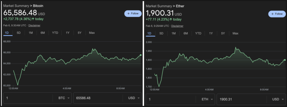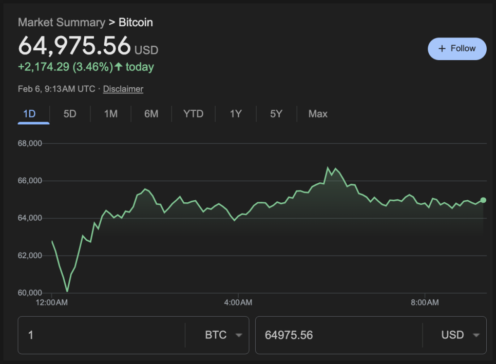 시장 참여자들 중 다수는 '공포에 사라'는 격언을 실행한 것으로 보이는 게, 미국 시간대 후반에 한때 비트코인 가격이 6만 달러 근처까지 밀렸다가 다시 6만5천 달러 안팎으로 반등했습니다.