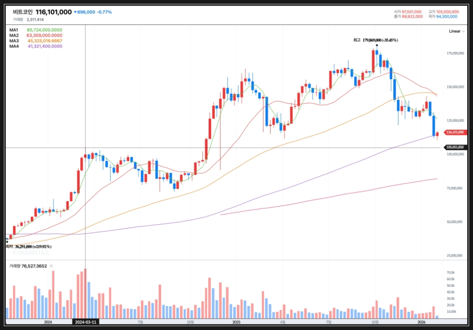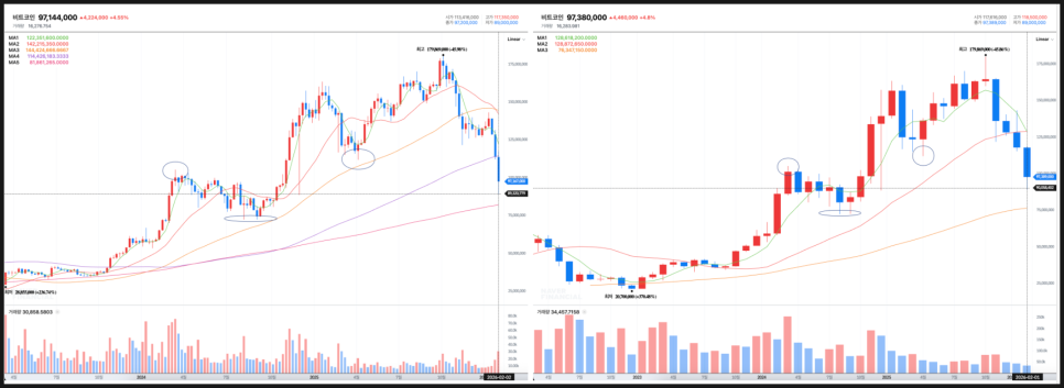 제가 2월 3일에 했던 이야기도 바로 이 지점이었습니다. 비트코인이 120주 이동평균선을 명확하게 하향 이탈할 경우, 2024 3월의 고점과 8월의 저점 사이까지, 즉 추가로 10%에서 20% 정도의 하락은 충분히 열어둬야 한다는 판단이었습니다. 다만 200주선은 지켜준다는 가정 하에서 말이죠. 그래서 당장은 120주선을 아슬아슬하게 지켜주고 있지만, 예의주시해야 한다고 정리했었습니다.