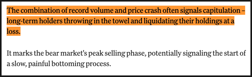 그런데 사상 최대 거래량과 급격한 가격 하락, 여기에 대규모 환매가 겹치면 ‘투항’ 국면으로 해석할 수도 있다는 시가도 있는데요. 장기 보유자들까지 손실을 감수하고 포지션을 정리하는 단계라는 의미입니다. 전형적으로는 베어마켓에서 매도가 가장 격해지는 구간, 이른바 피크 셀링 단계에 해당할 수 있습니다. 이후에는 빠른 반등보다는 길고 지루한 바닥 다지기 과정이 이어지는 경우가 많았죠.