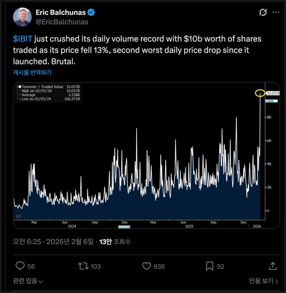 한편 블랙록의 비트코인 현물 ETF인 아이셰어즈 비트코인 트러스트 IBIT가 하루 거래대금 100억 달러를 기록하면서 사상 최고치를 새로 썼습니다. 블룸버그 ETF 애널리스트 에릭 발추나스는 X를 통해 “IBIT가 하루 거래대금 기록을 완전히 갈아치웠다”며, 같은 날 ETF 가격이 13% 하락했고 이는 상장 이후 두 번째로 큰 일일 낙폭이었다고 평가했습니다.