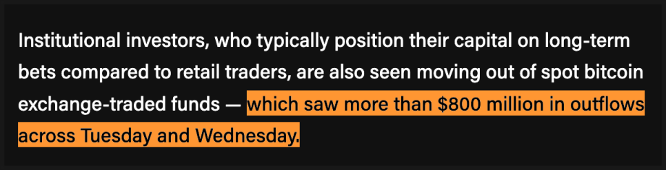 기관 투자자들의 움직임도 부담 요인입니다. 개인 투자자보다 장기 관점으로 움직이는 기관들 역시 최근 비트코인 현물 ETF에서 자금을 빼고 있는데, 화요일과 수요일 이틀 동안만 8억 달러가 넘는 순유출이 발생했습니다.