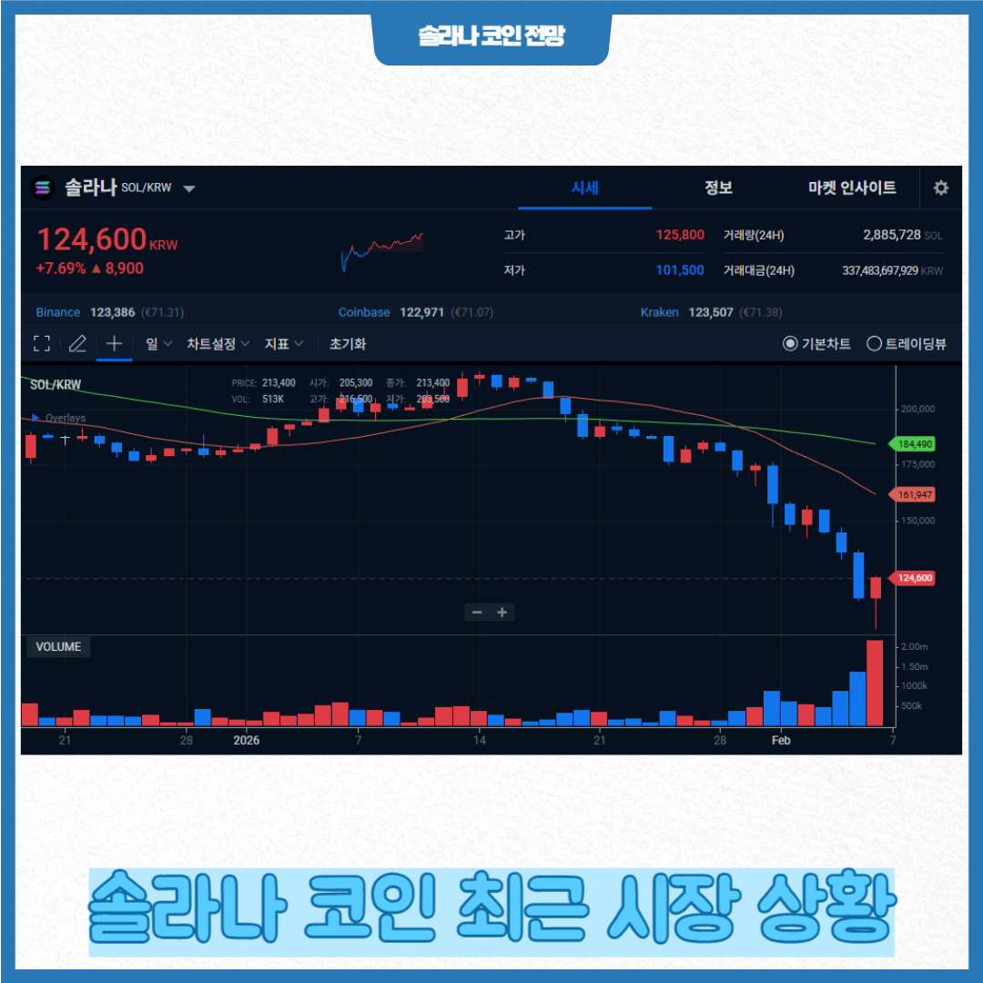 2026년 들어 솔라나(SOL)는 하락 조정 흐름을 보이며 주요 지지선을 시험하고 있습니다. 비트코인 등 시장 전체 변동성 확대와 함께 SOL 가격도 단기 약세가 이어진 사례가 관측되고 있습니다. 투자 심리가 약해지면서 기술적 조정 압력이 존재합니다.