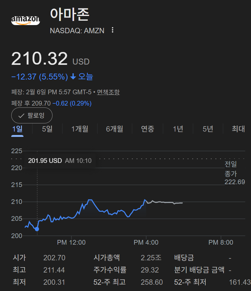 아마존의 주가는 전일대비 5.55% 하락한