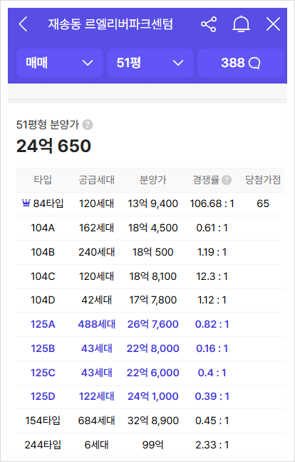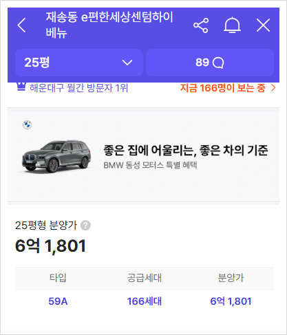 전용59타입 밖에 나오지 않았고 분양가는 6억 1,801만원이다. 계약금이 5%이므로 3,090,050원이다. 주체 측에선 고분양가 논란을 고려하여 발코니 확장비를 무상, 계약금 역시 5%로 적용하는 파격적인 혜택으로 최근 핫해지는 해수동 가격상승에 기여할 것으로 보인다. 입주는 27년 10월 예정이다.