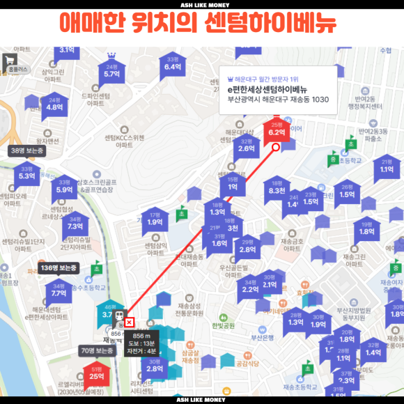 그렇지만 르엘리버파크센텀은 84타입만은 100:1을 넘는 경쟁률을 보이면서 교통망과 오션뷰 모두를 챙기면서 센텀 내 비싼 아파트로 자리잡았다. 하지만 센텀하이베뉴는 냉정하게 아쉬운 입지로 단지 내 옹벽을 설치할 정도로 경사도가 심하다. 센텀시티나 인근 지하철역까지 생각보다 거리가 먼데 재송역까지도 855미터의 거리에다 경사도까지 있어 걸어가기는 힘들다. 분양가 역시 25평이 6억원으로 평당 2,500~2,800만원 수준이라 심리적 부담감도 느낄 수 있다.