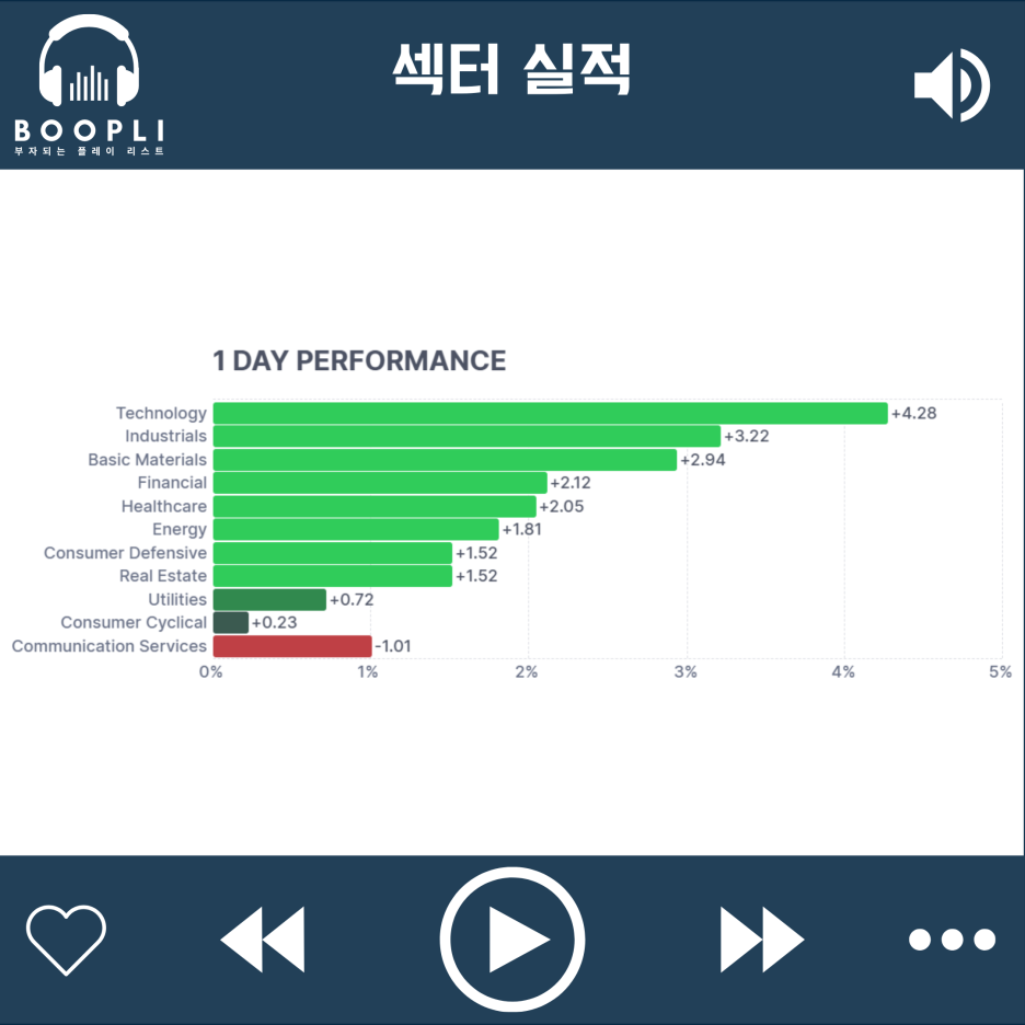 빅테크 기업들의 대규모 AI 자본 지출에 대해 젠슨 황 엔비디아 CEO가 긍정적으로 발언하자 기술 섹터가 상승 주도, 이어서 산업재, 원자재, 금융, 헬스케어, 에너지, 경기 방어주, 부동산, 유틸리티 순으로 강세