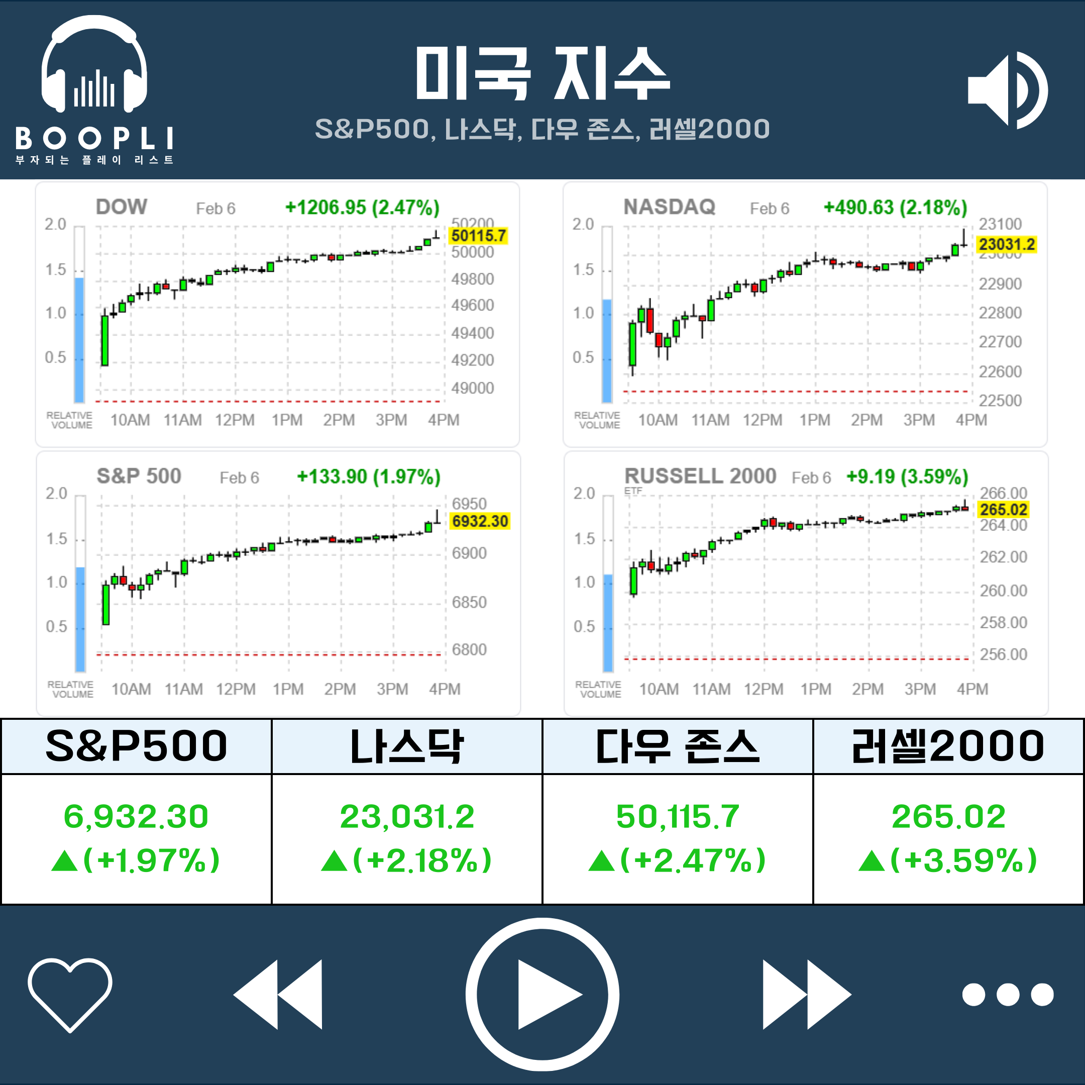 전일 미국 증시는 인공지능(AI) 인프라 투자 지속성에 대한 신뢰가 강화되고 비트코인 및 귀금속 시장이 급반등한 영향으로 다우존스(+2.47%)가 사상 처음으로 50,000p를 돌파한 가운데 나스닥(+2.18%), S&P500(+1.97%), 러셀2000(+3.59%) 등 주요 지수가 일제히 상승 마감