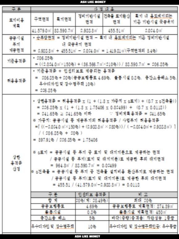 기존 용적률이 183%이므로 기존 연면적은 17,833평이고 최대 허용용적률 299%이므로 최대 연면적은 29,137평이고 임대주택 세대가 128세대, 약 15%(3,411평) 수준이므로 일반분양 면적은 7,893평이다.